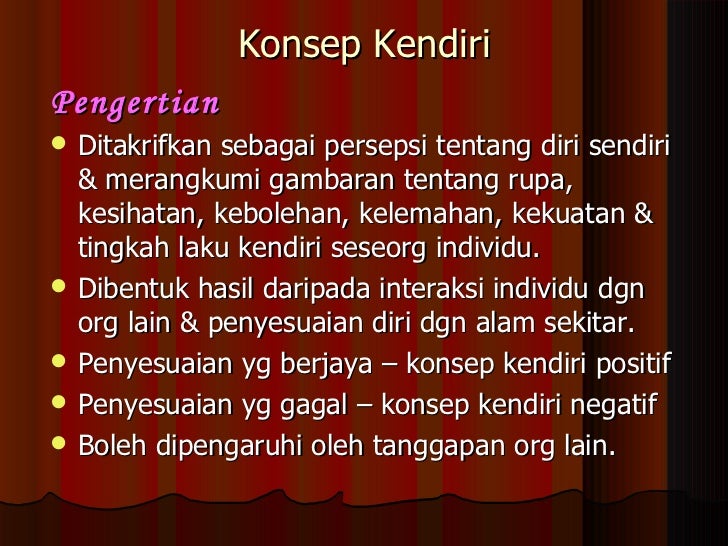 4 Faktor yang mempengaruhi konsep kendiri negatif Seperti mana yang kita ketahui seorang individu yang baru dilahirkan masih belum mempunyai konsep kendiri. Menurut Brown 1998 Konsep Kendiri ialah Tanggapan kita terhadap diri kita sendiri Apabila kita memulakan pernyataan dengan menggunakan kata saya atau aku seperti katanya Aku.